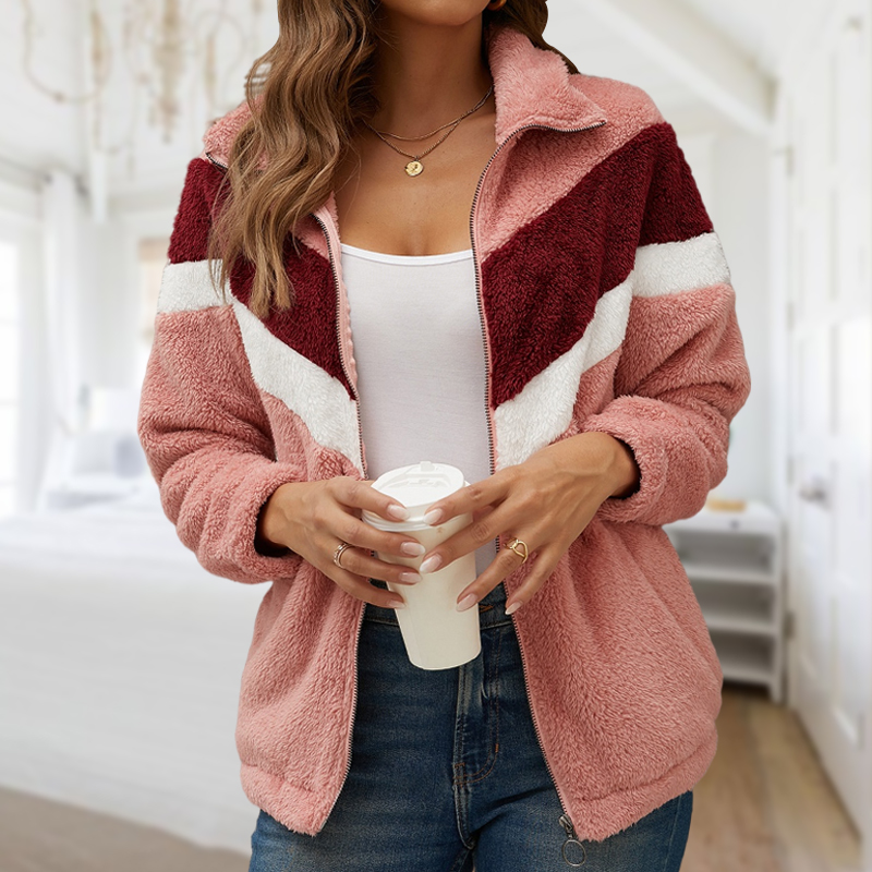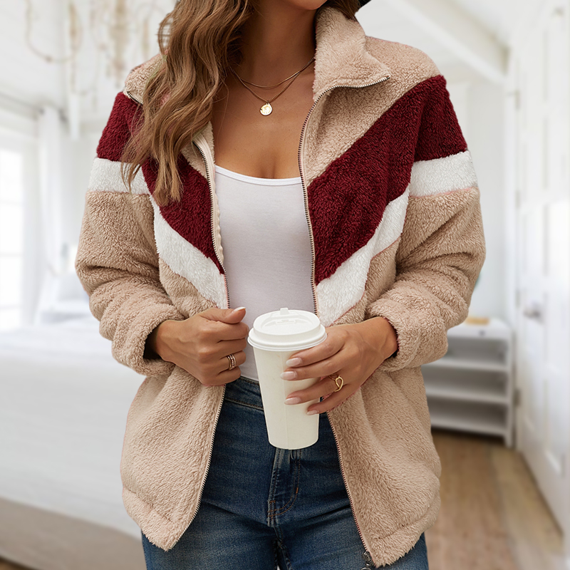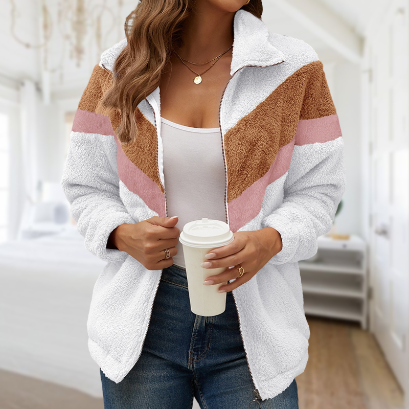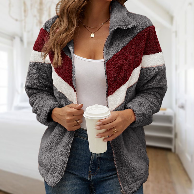Plus Size Color Block Zipper Long Sleeve Fleece Jacket