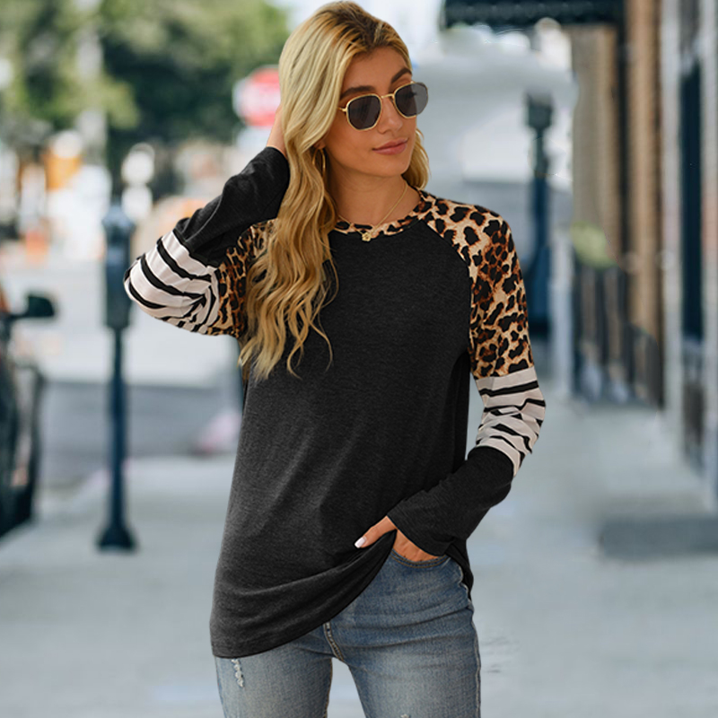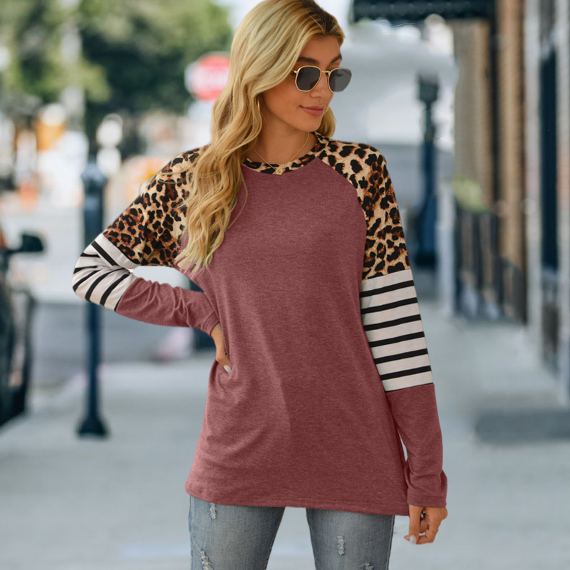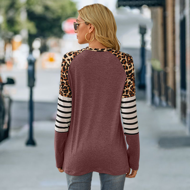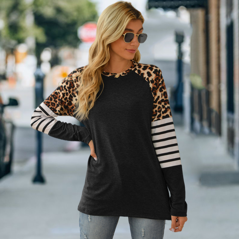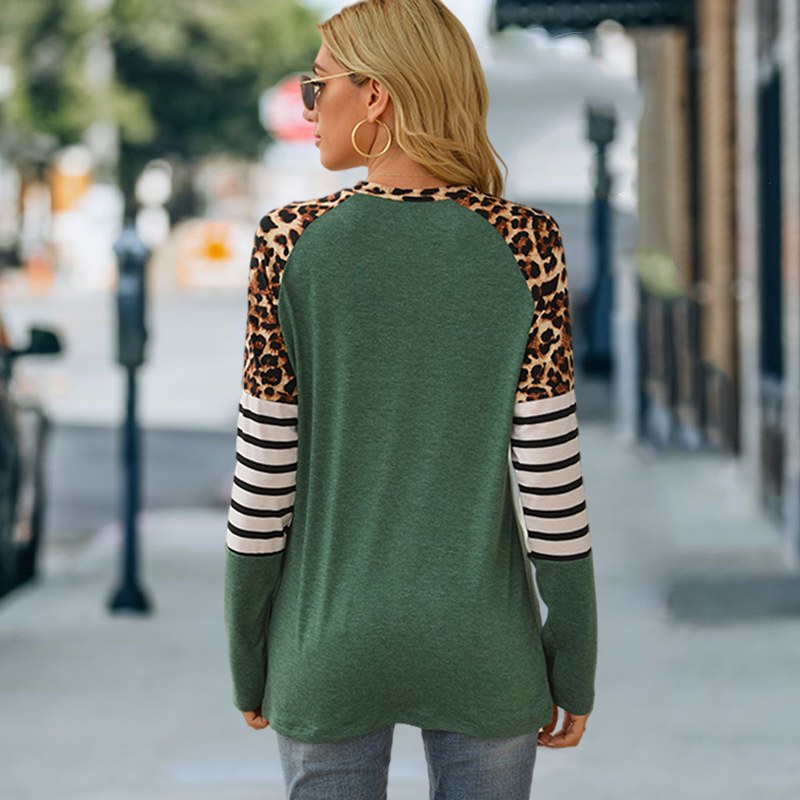 Leopard Striped Splicing Long-Sleeved Casual T-shirt