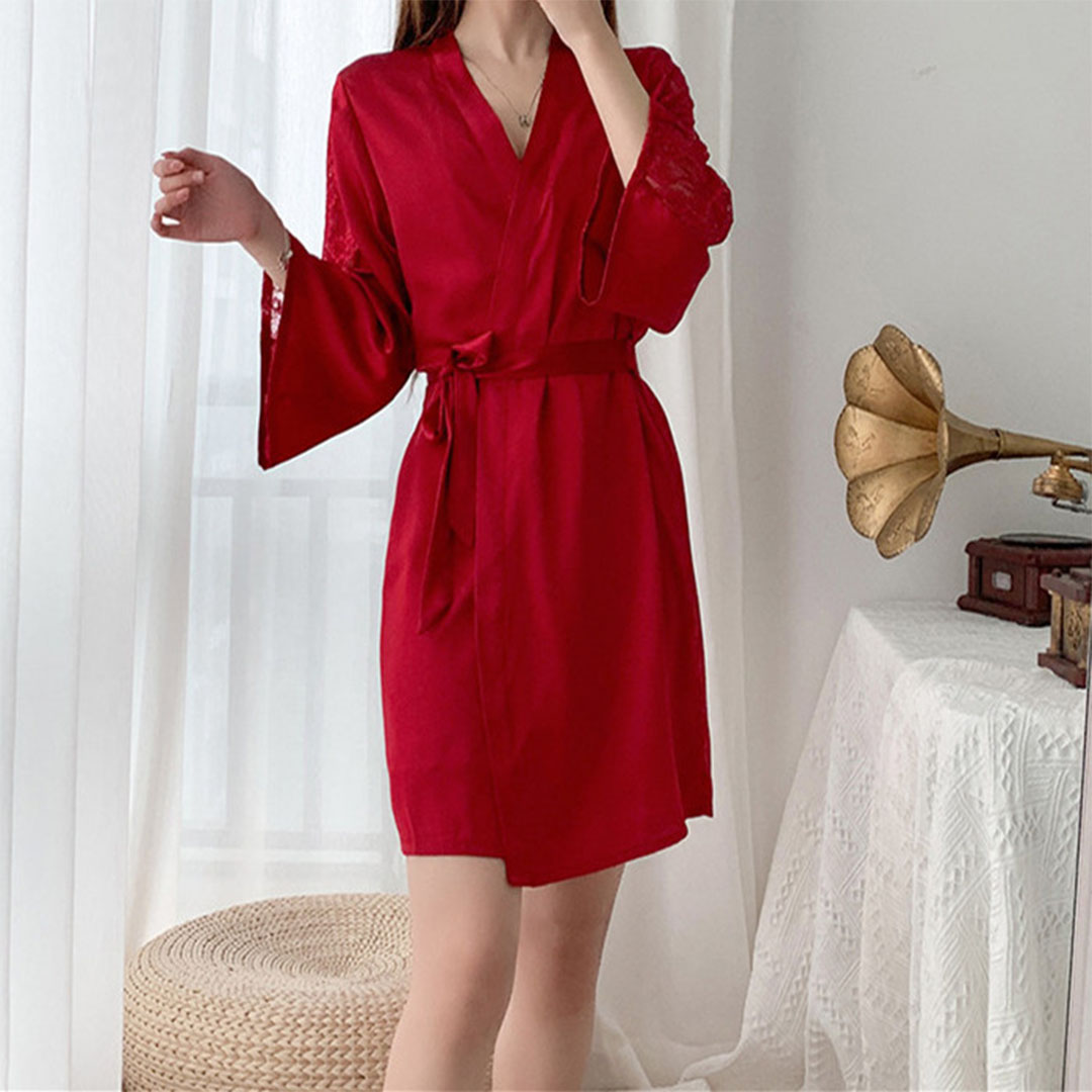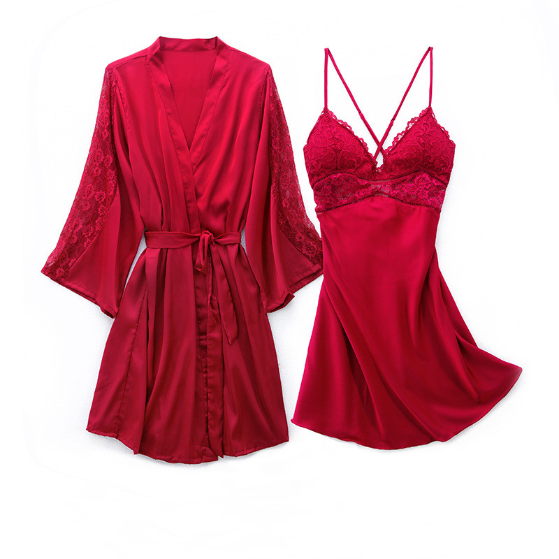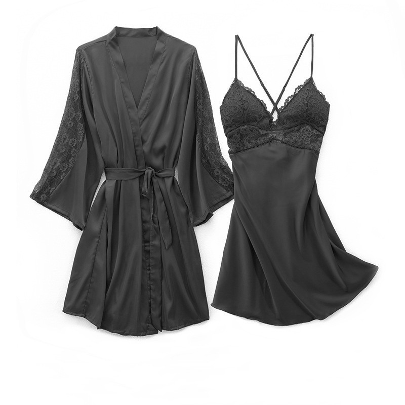 Satin Eyelet Lace Kimono Robe and Slip Dress Set
