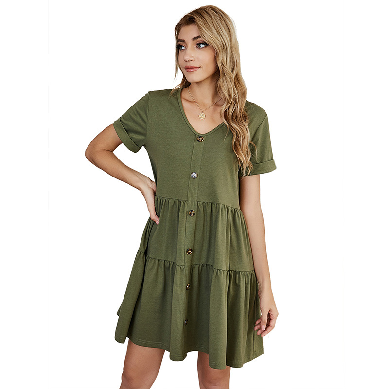 This layered mini dress in army green can give you an effortlessly relaxed vibe, featured a round neckline, button up, and loose waist, the flattering fit and flare style of this dress makes it easy to dress up or down. Made of lightweight cotton, wrap yourself in all-day comfort with this classic green mini dress.