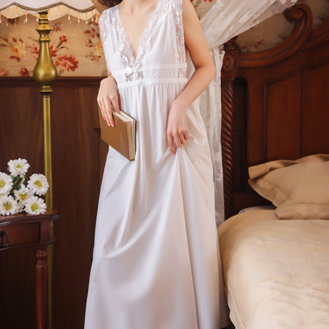 The stunning lace maxi dress features a plunging v neckline detail and body-skimming silhouette that's loose but gives shape. This feminine style nightgown is the ultimate in romance with this floaty full-length hem and soft lace trim. Gorgeous double waistline details add a touch of something special and provide a perfect curve.