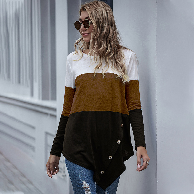 Color Blocking Irregular Button Round Neck Casual Long Sleeve T-Shirt