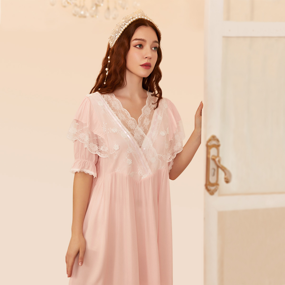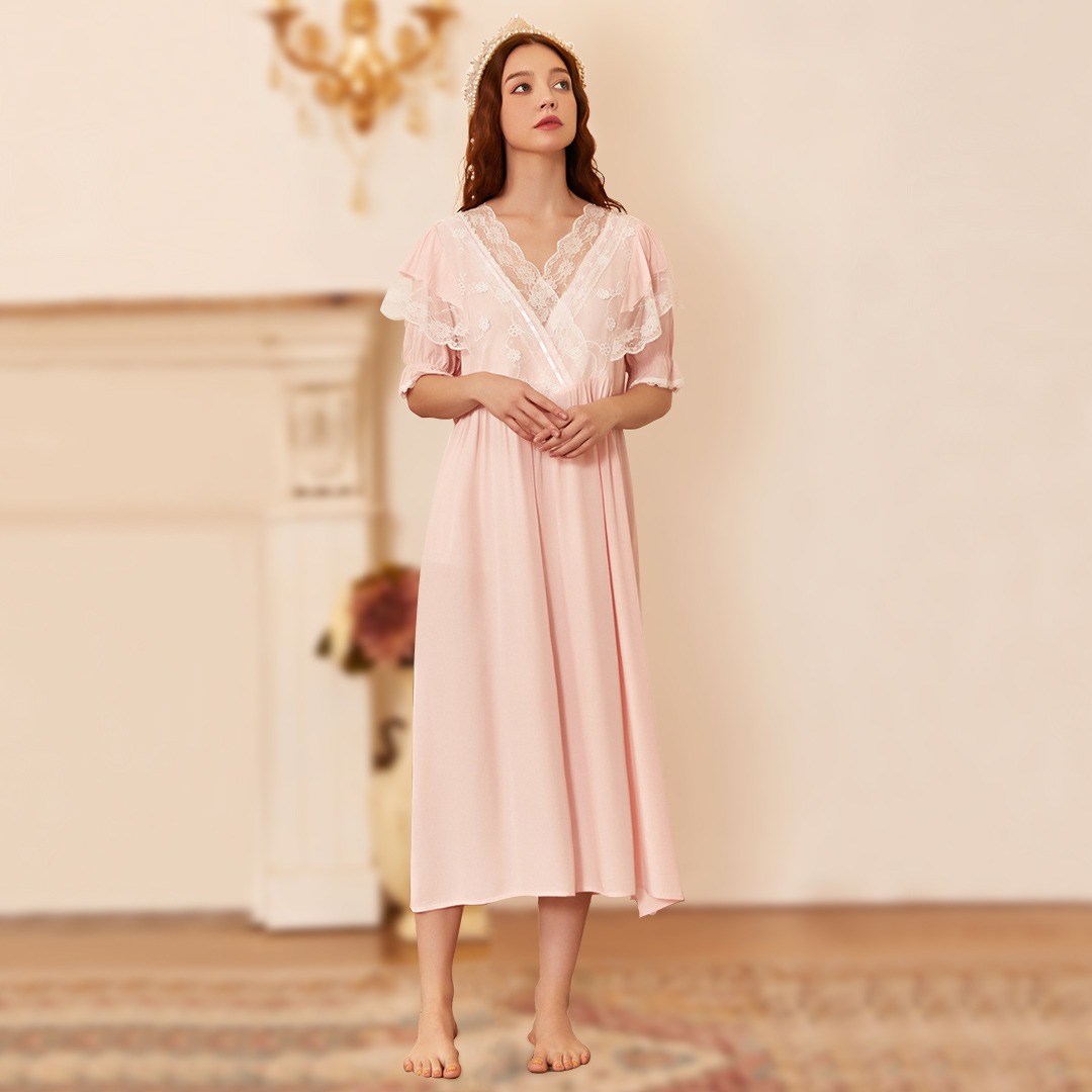 You will feel like you are a princess! This stunning pink maxi dress with very light chiffon fabric featured V-neckline with a lace ruffle border for a vintage look. This long maxi dress has a super feminine silhouette with a floaty hemline. It's so easy to dress up or down with a loose waist.