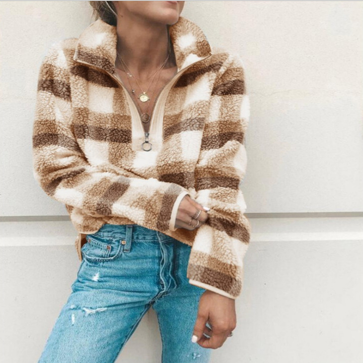 Plaid Long Sleeve High Collar Zipper Fleece Shirt