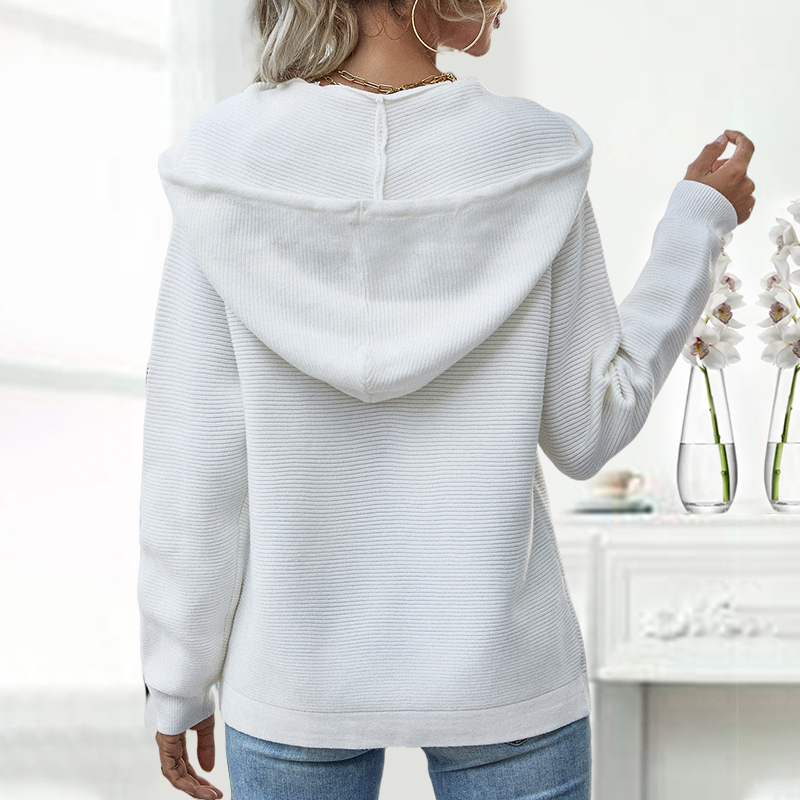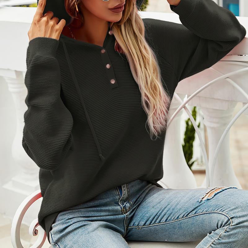 Cute hooded sweater with adjutable spaghetti straps for autumn winter days. The details of button up and v neck design will show your passion and vitality. The pullover sweater is the perfect piece to wear anywhere. Feel comfortable and look your best in the soft woolen fabric. The dropped shoulder at long sleeves provides a relaxed loose fit and trendy look.