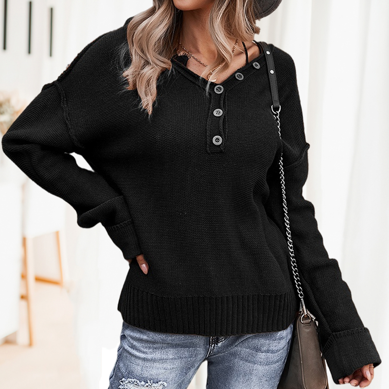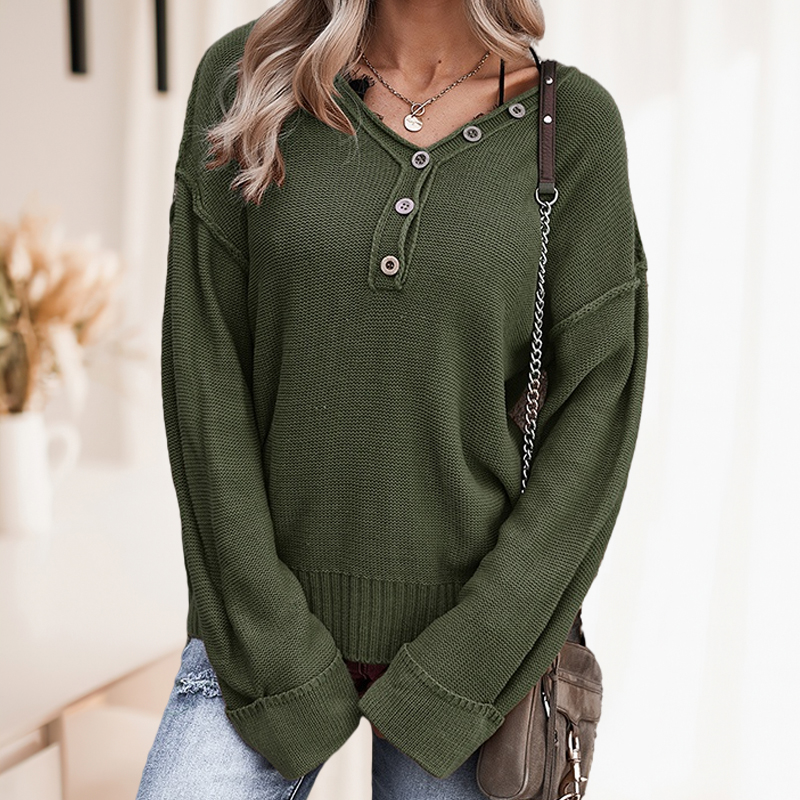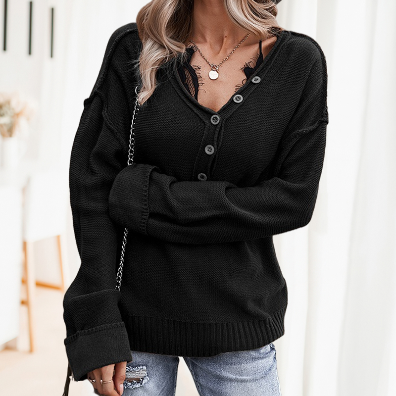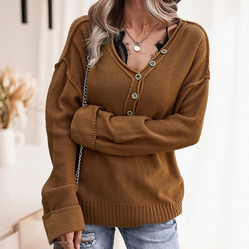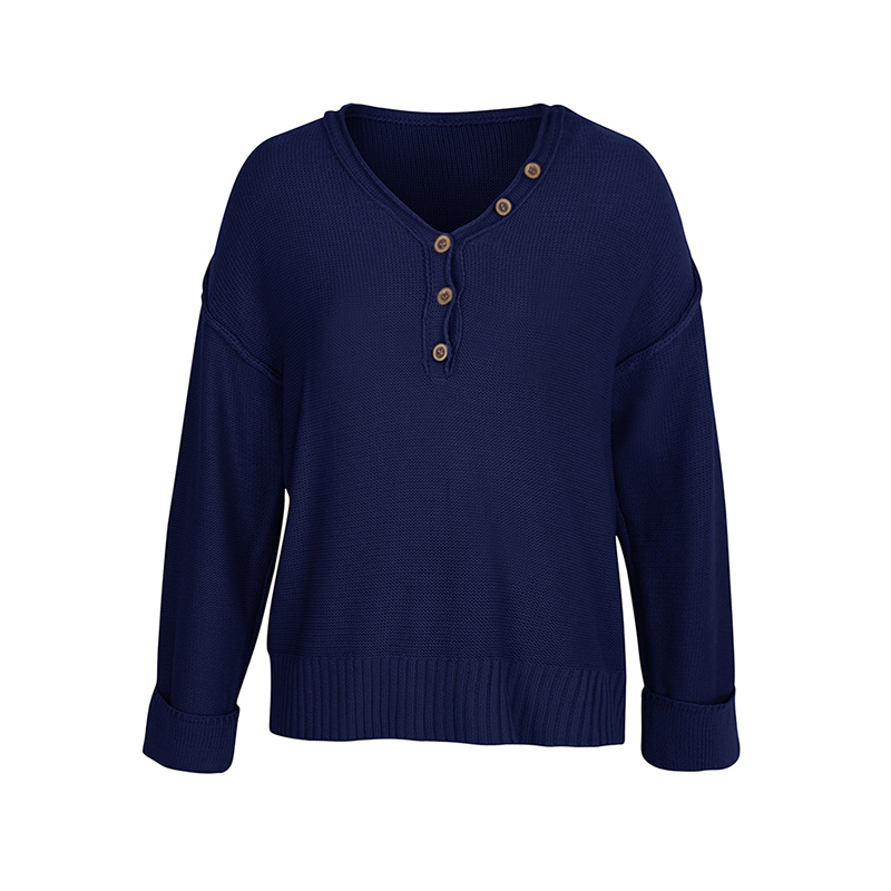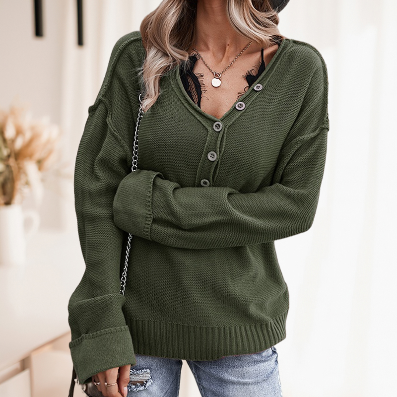 V-neck Button Solid Color Long Sleeve Knitted Sweater