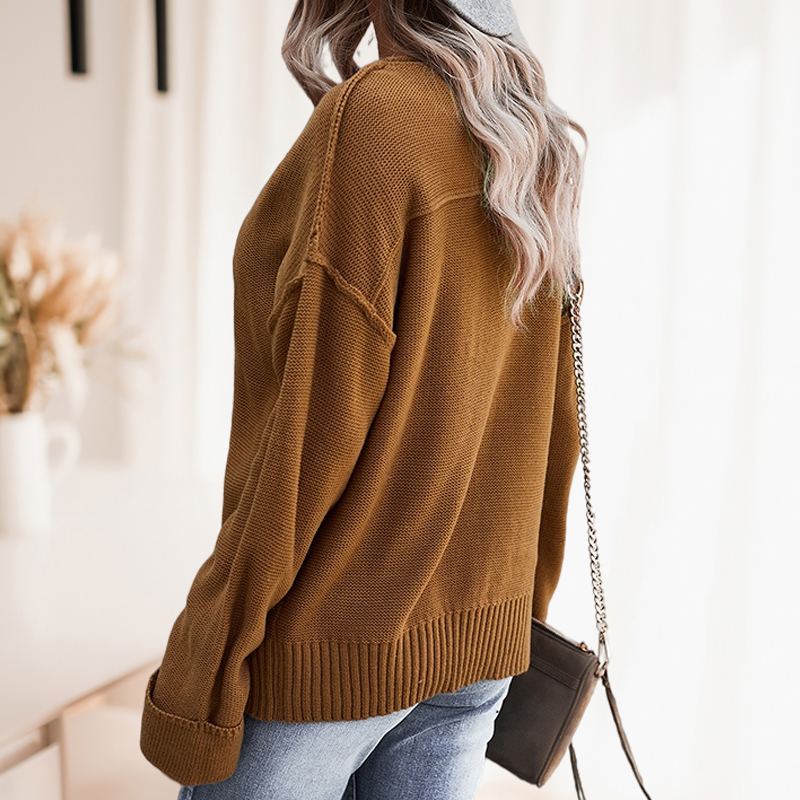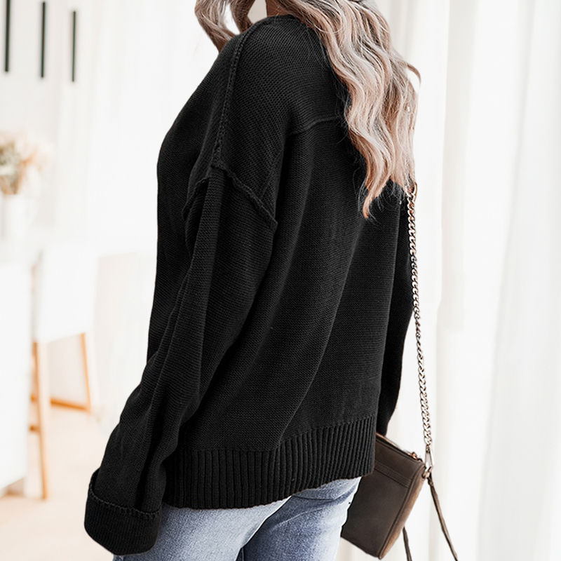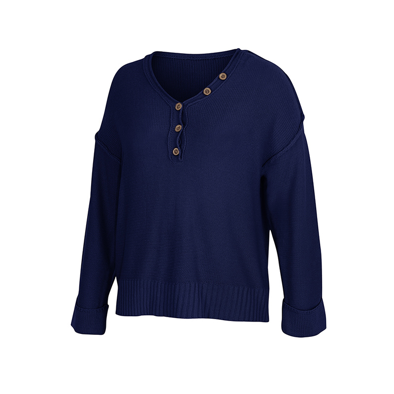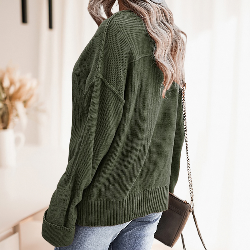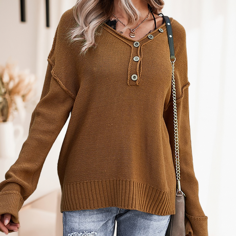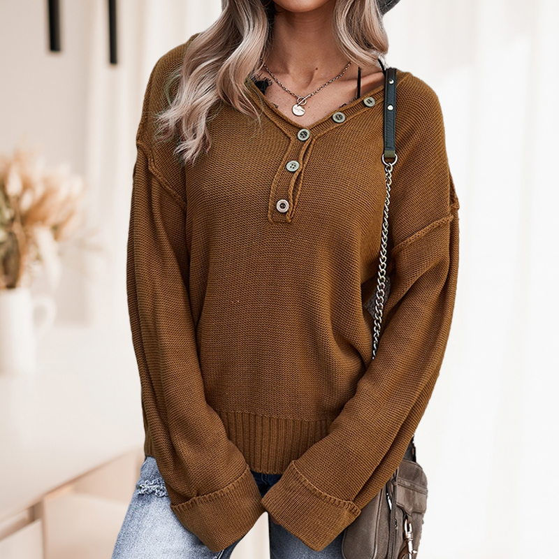 V-neck Button Solid Color Long Sleeve Knitted Sweater